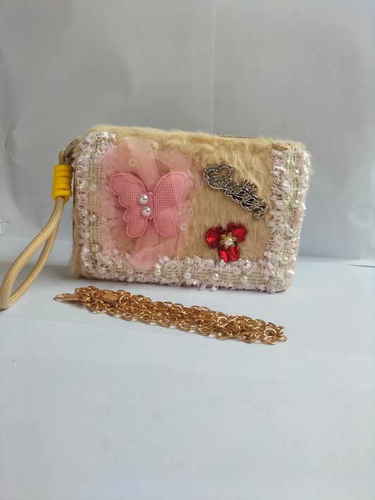 A white fluffy rectangular clutch adorned with a pink butterfly applique, a gold “LOVE” charm,...