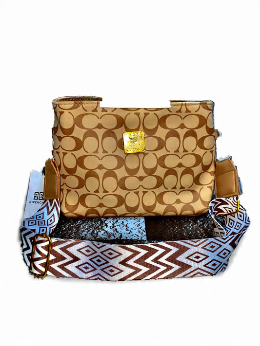 The purse is a beige‑brown *Givenchy*‑inspired sling bag with a monogram “G” pattern on canvas,...