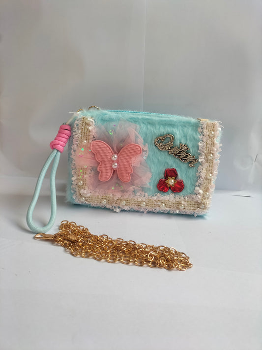 A sky blue fluffy rectangular clutch adorned with a pink butterfly, a gold “LOVE” charm, a red bow,...