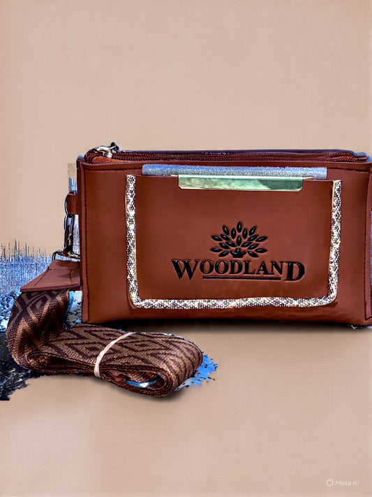 The purse is a brown leather‑style sling bag branded *WOODLAND* with a glitter‑bordered front panel,...