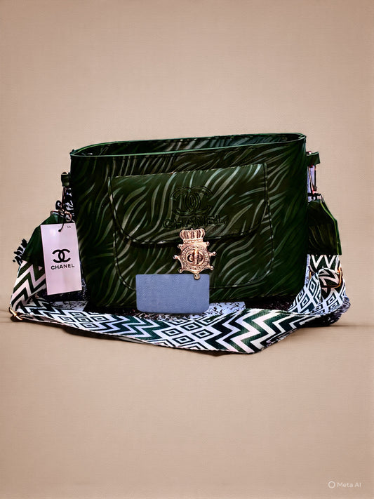 The purse is a green zebra‑striped leather bag with a rose‑gold crowned‑compass emblem and an...