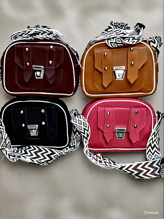 A masterd leather handbag with a front graphic of a woman in a purple patterned jacket holding a phone. It...