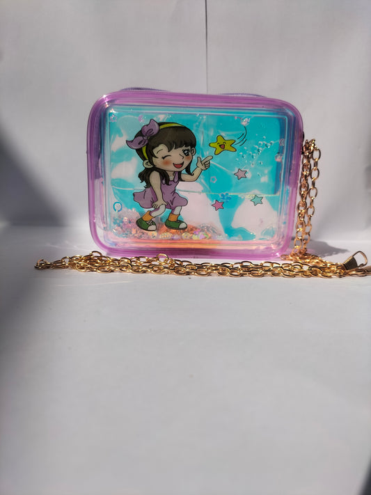 The purse is a pink transparent rectangular shoulder bag with a gold chain strap, zip closure, and a cartoon...