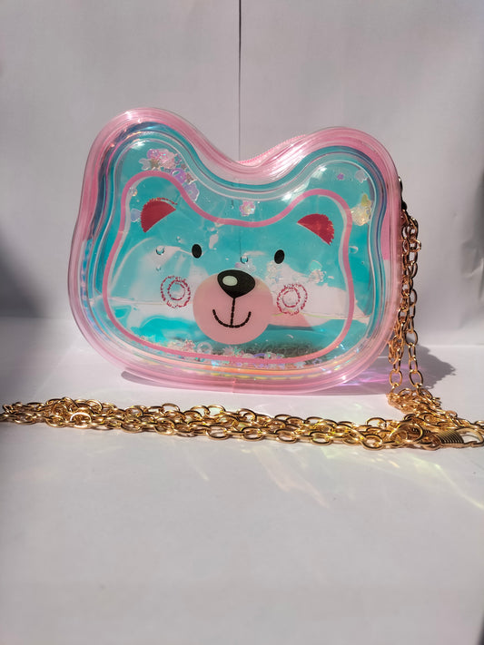 The purse is a baby pink transparent bear-shaped shoulder bag with a gold chain strap....