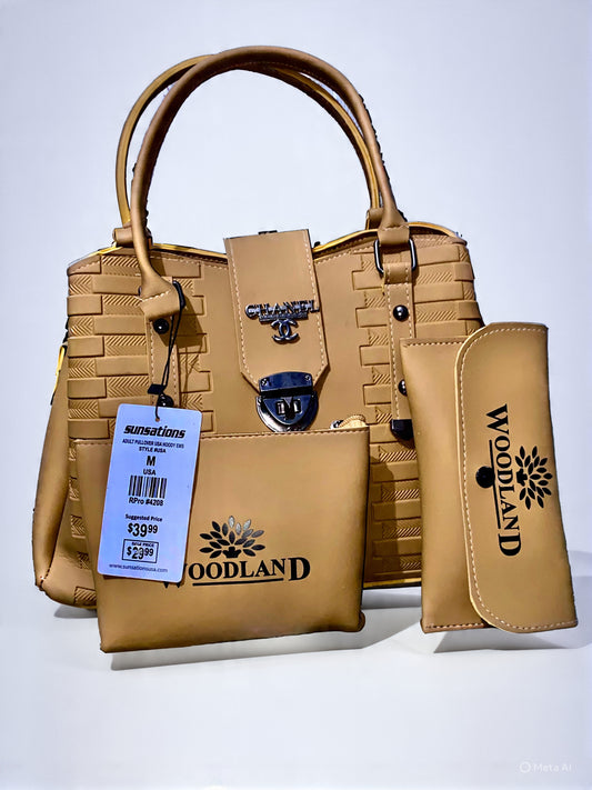A tan leather handbag set with woven texture, silver “CHANEL” logo, and “WOODLAND” branding on...