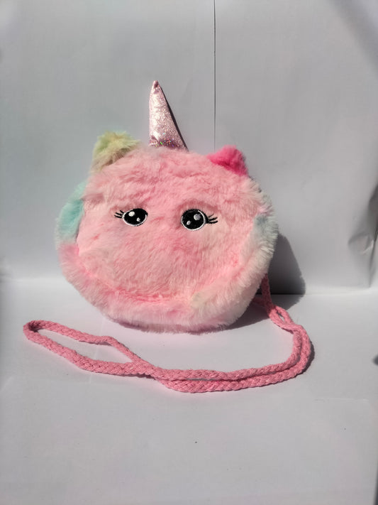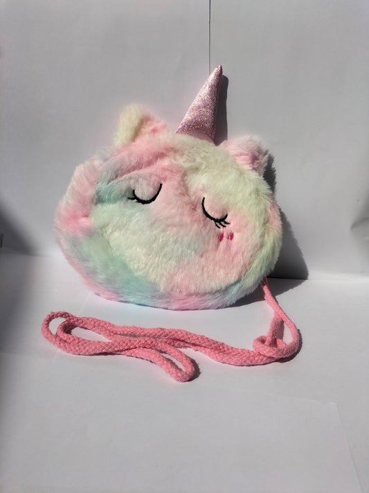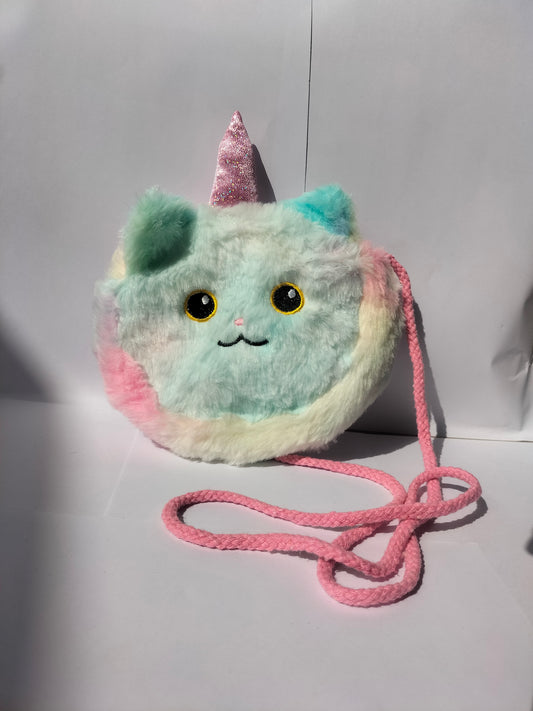 A cute, round, furry cat‑unicorn crossbody purse with pastel mint‑green fur, pink/yellow accents, glittery eyes,...