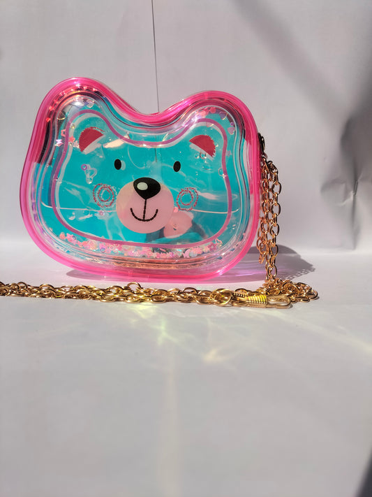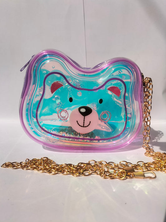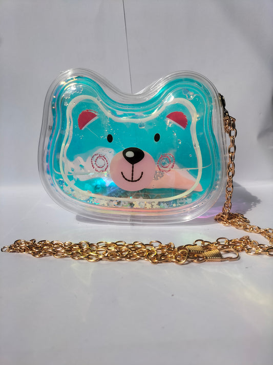 The purse is a sky blue transparent bear-shaped shoulder bag with a gold chain strap. It has...
