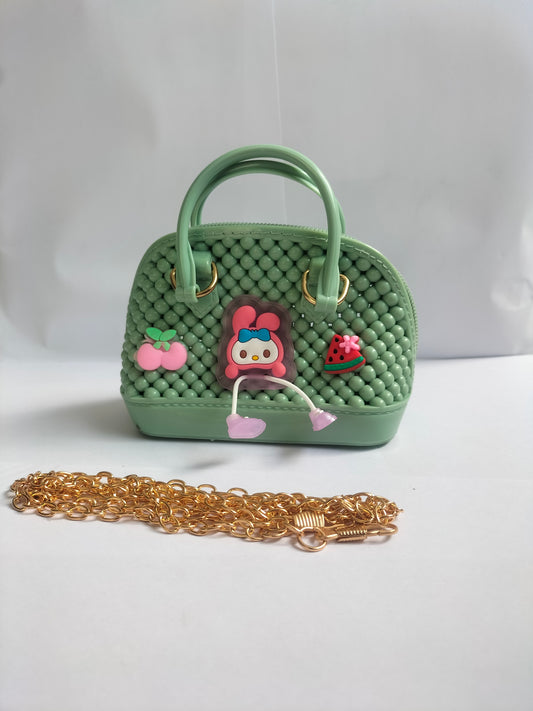 A mint‑green woven‑bead handbag with gold hardware, decorated with a pink peach, a My Melody...