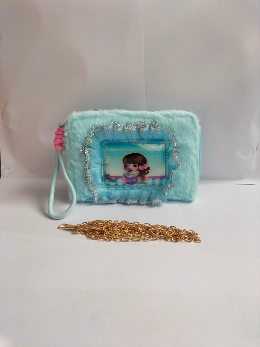 A sky blue fuzzy (plush) rectangular purse with a clear acrylic window framed by silver tinsel garland. The window displays...