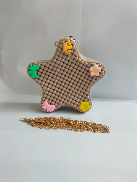 The light brown star-shaped purse has a textured surface and is decorated with colorful flower and cupcake appliqués. It...
