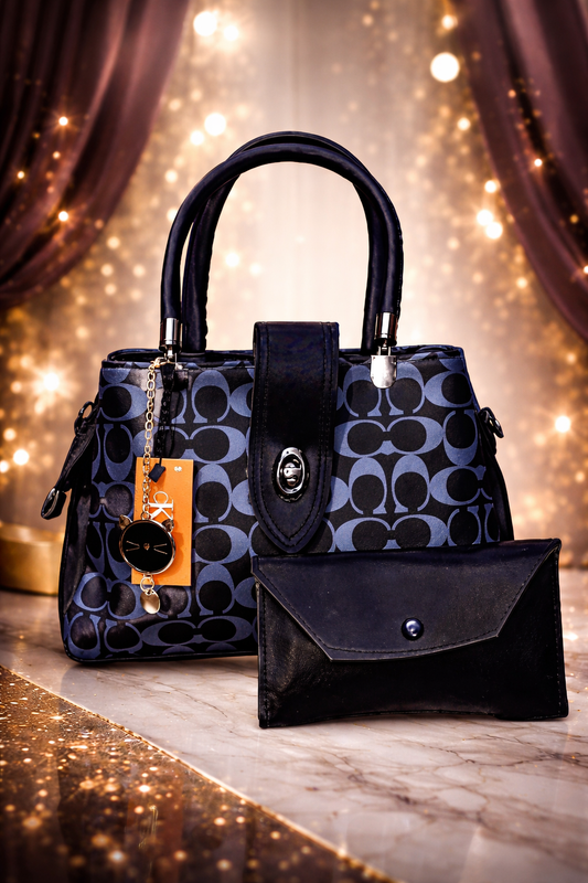 A stylish and elegant handbag with a modern blue and black design. It features comfortable...