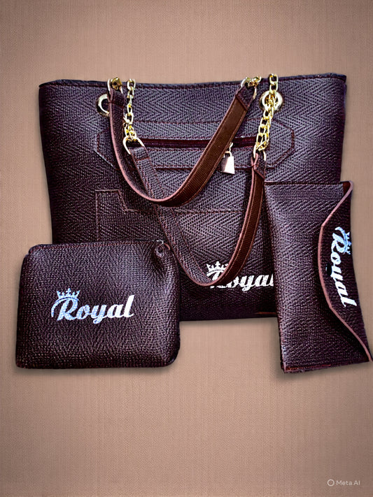 The purse set is a brown textured 3‑piece collection branded *“Royal”* with a crown logo....