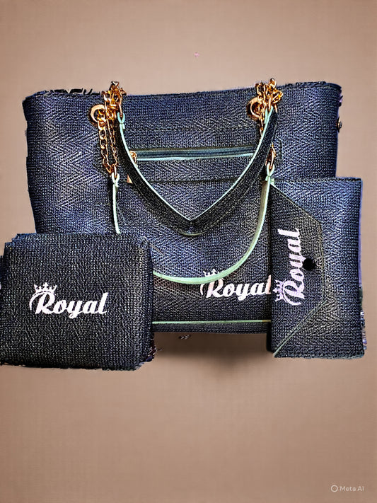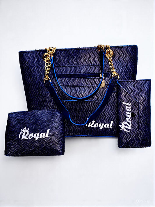 The purse set is a blue textured 3‑piece collection branded *“Royal”* with a crown logo....