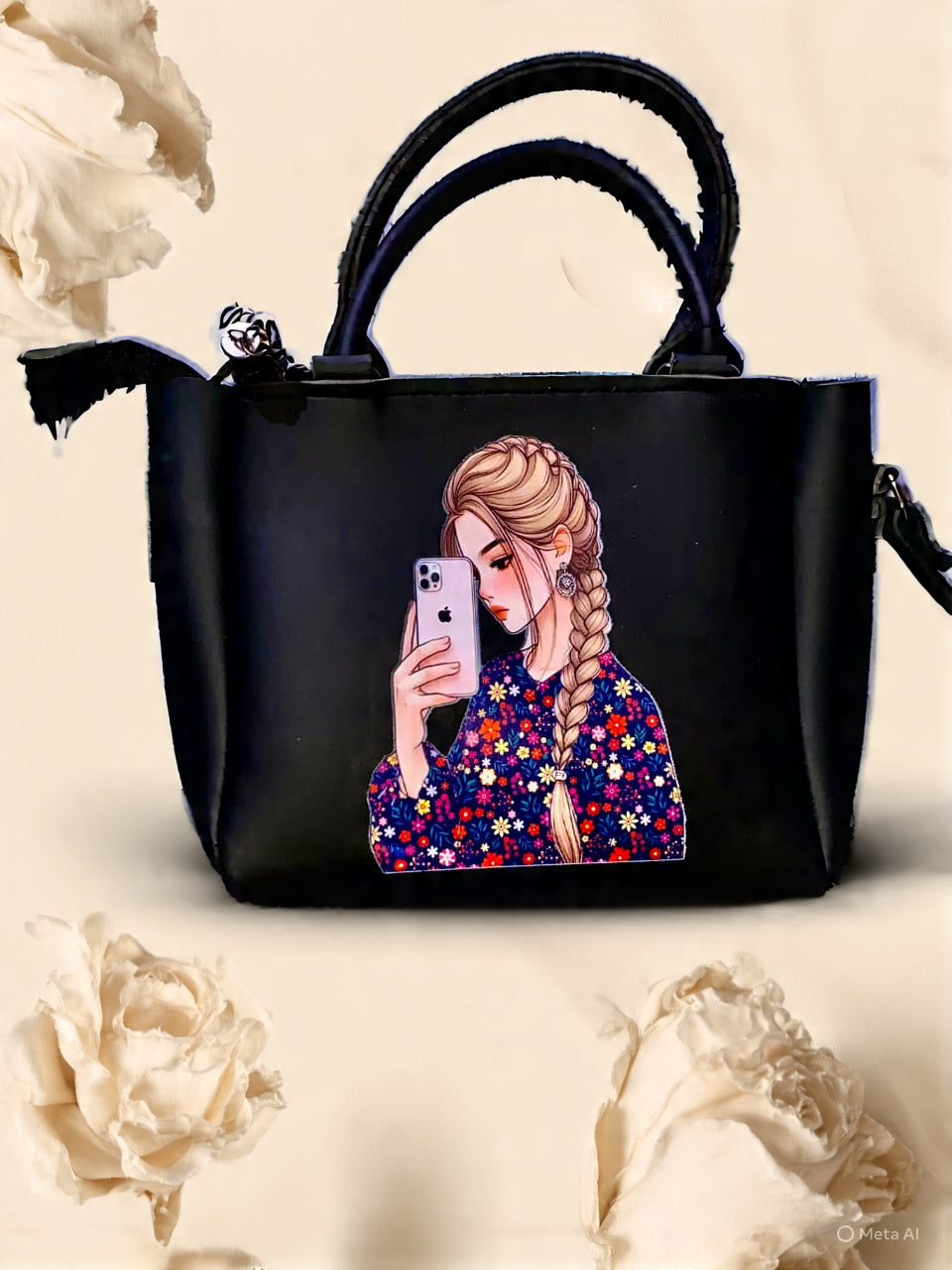 A dark blue leather handbag with a front graphic of a woman in a purple patterned jacket holding a phone. It has a shoulder strap, small side pocket with button, and brand tag “LADY MANIA”.