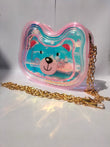 The purse is a baby pink transparent bear-shaped shoulder bag with a gold chain strap. It has a blue interior featuring a cartoon bear face with pink ears, nose, and cheeks, and contains holographic glitter accents inside.