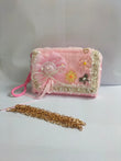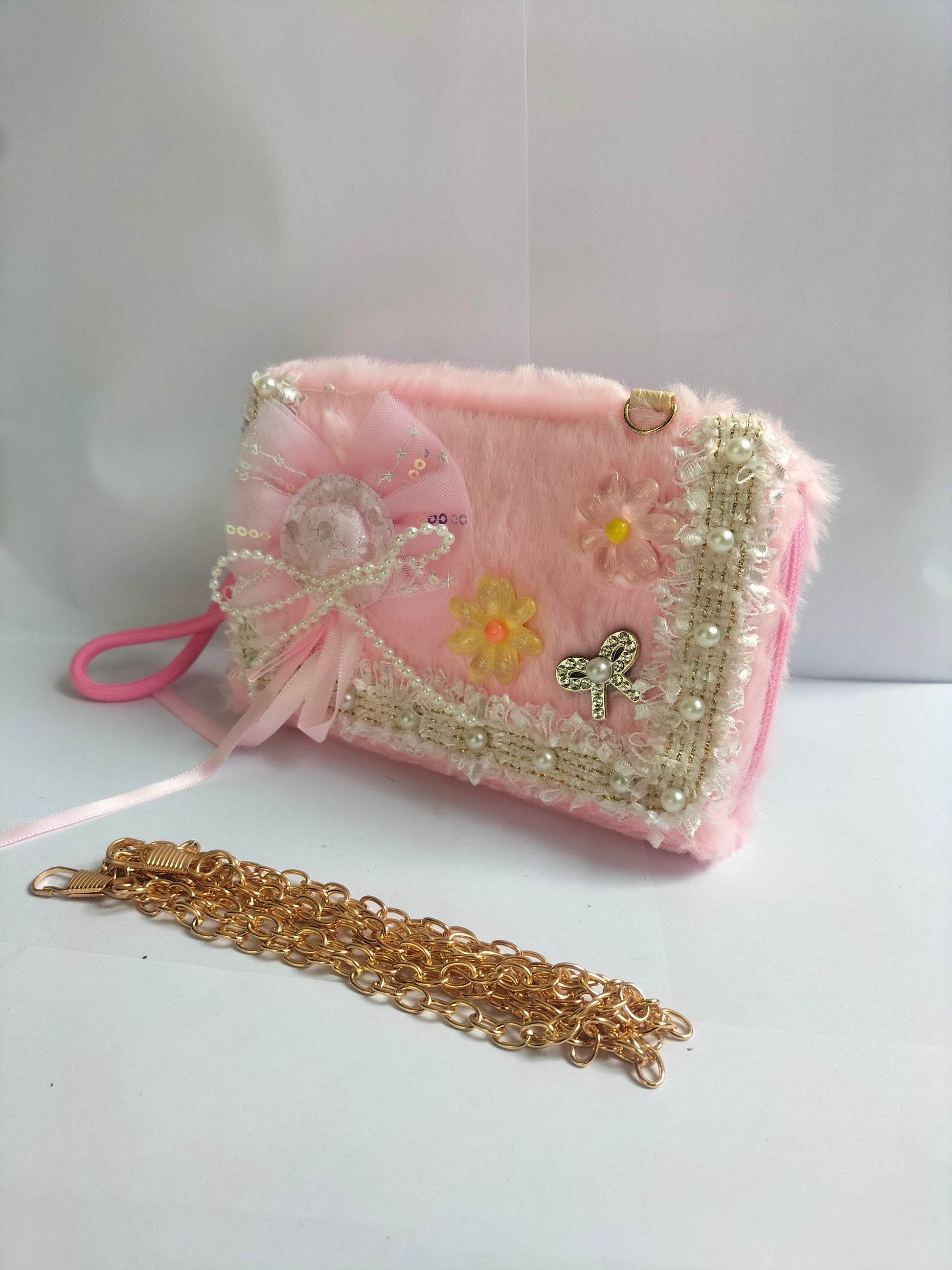 A baby pink beige fuzzy pouch with lace, pearl trim, pink bow, and floral embellishments; includes a gold zip and detachable gold chain strap. ✨