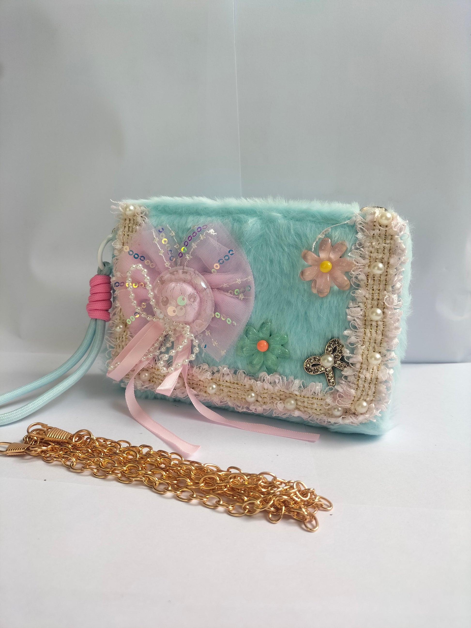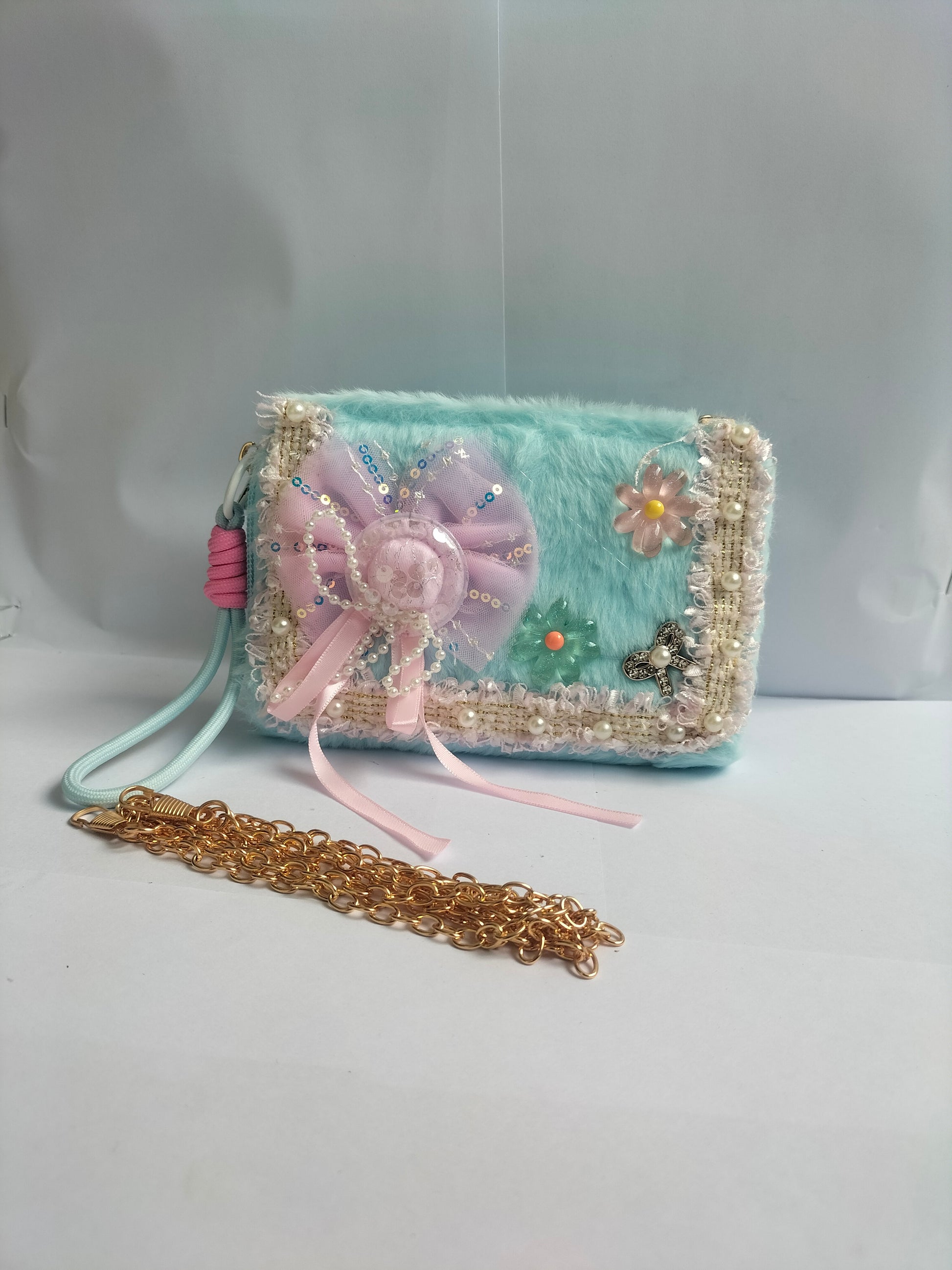 A sky blue beige fuzzy pouch with lace, pearl trim, pink bow, and floral embellishments; includes a gold zip and detachable gold chain strap. ✨