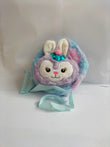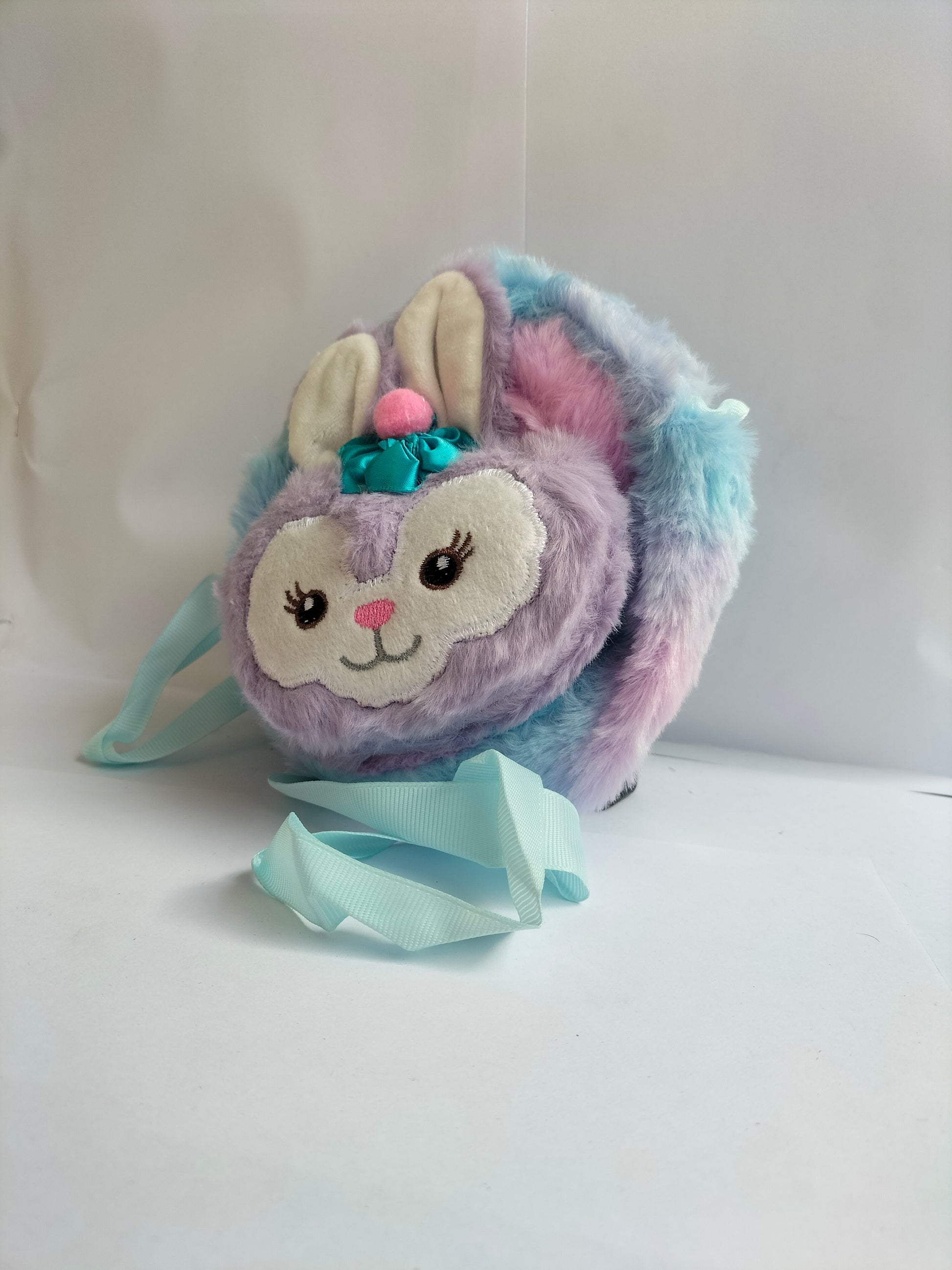A pastel-colored, fuzzy bunny-shaped purse with embroidered face, pink nose, black eyes with eyelashes, and a blue flower embellishment on its ears. It has pink ribbon straps for carrying. ✨