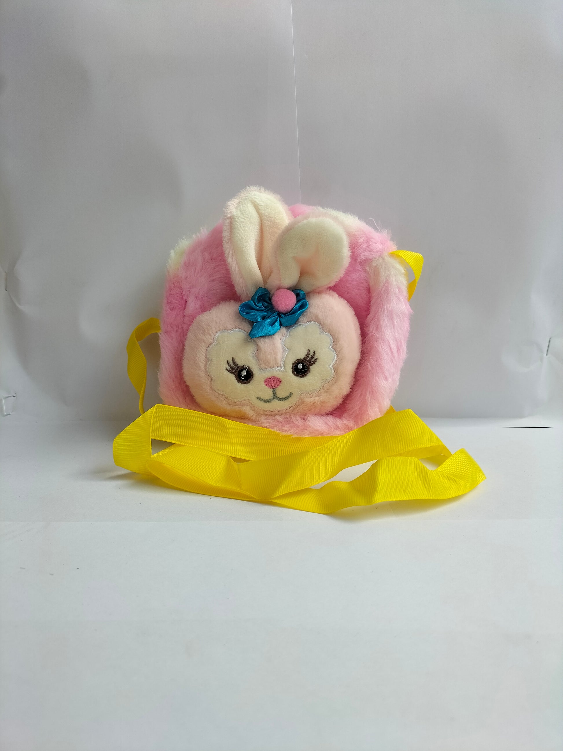 A pastel-colored, fuzzy bunny-shaped purse with embroidered face, pink nose, black eyes with eyelashes, and a blue flower embellishment on its ears. It has pink ribbon straps for carrying. ✨