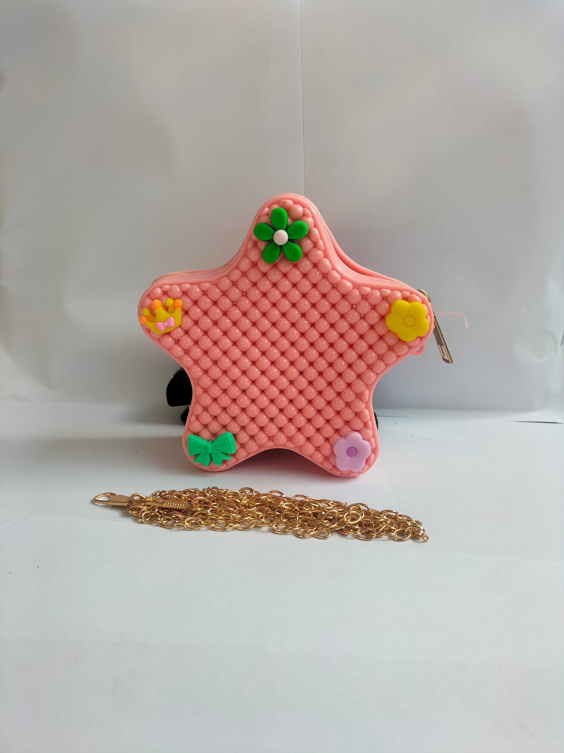 The peach star-shaped purse has a textured surface and is decorated with colorful flower and cupcake appliqués. It comes with a gold chain strap for shoulder carrying.