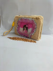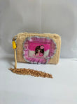 A yellow fuzzy (plush) rectangular purse with a clear acrylic window framed by silver tinsel garland. The window displays a cartoon girl illustration. The bag has a pink strap and a detachable gold chain shoulder strap lying beside it.