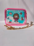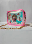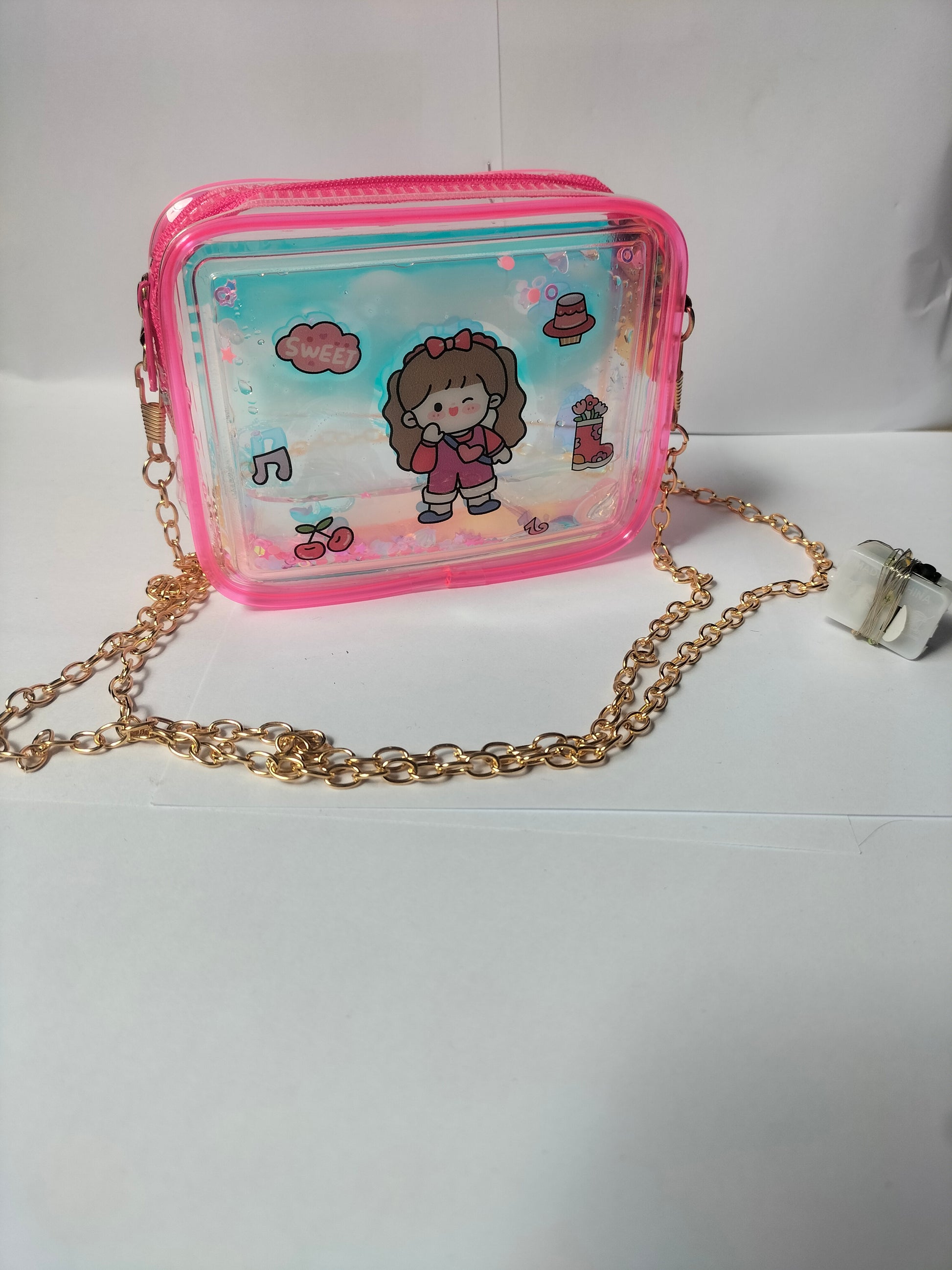 The purse is a pink transparent rectangular shoulder bag with a gold chain strap, zip closure, and a cartoon girl design with stickers and holographic glitter inside.