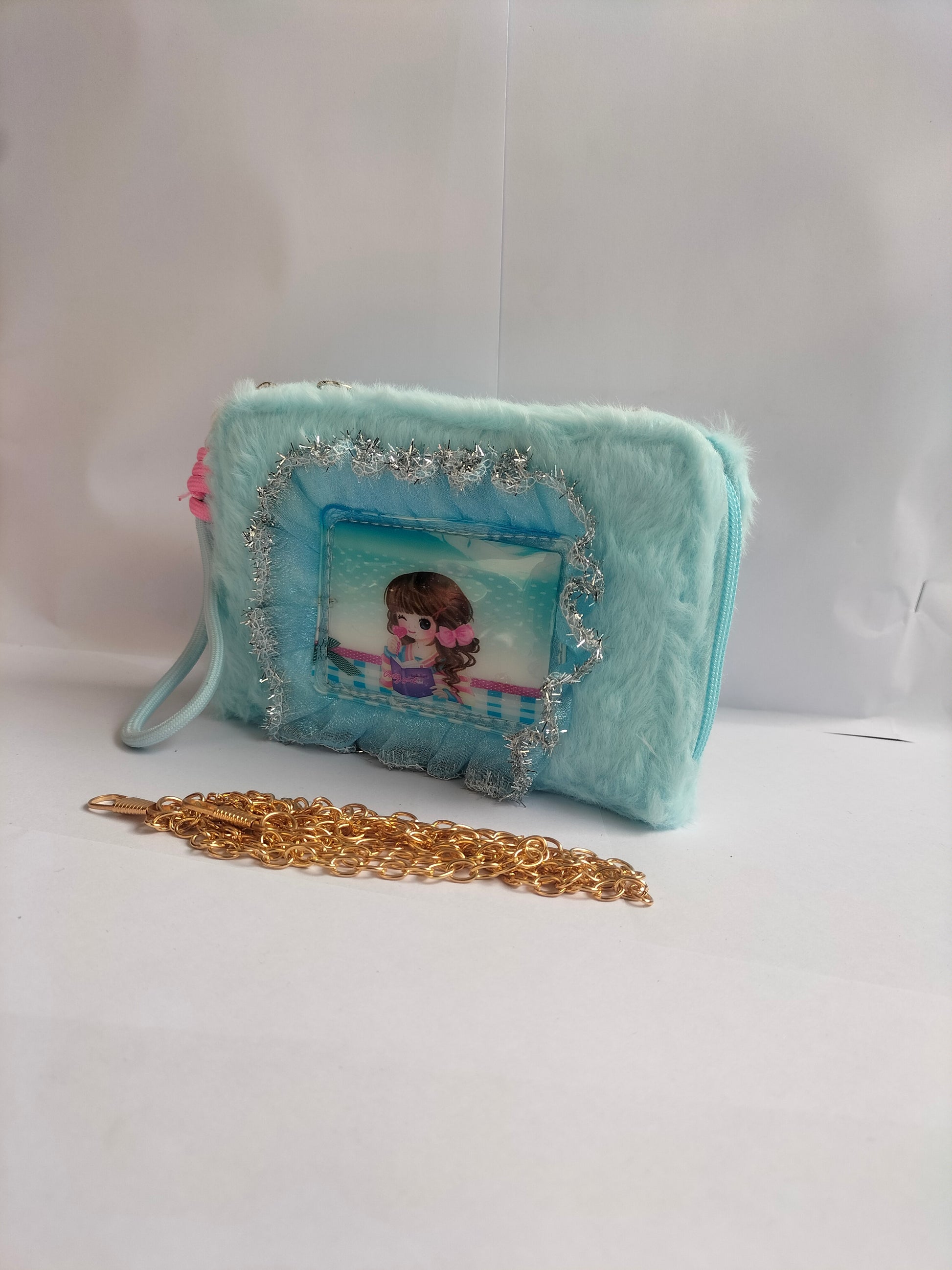A sky blue fuzzy (plush) rectangular purse with a clear acrylic window framed by silver tinsel garland. The window displays a cartoon girl illustration. The bag has a pink strap and a detachable gold chain shoulder strap lying beside it.