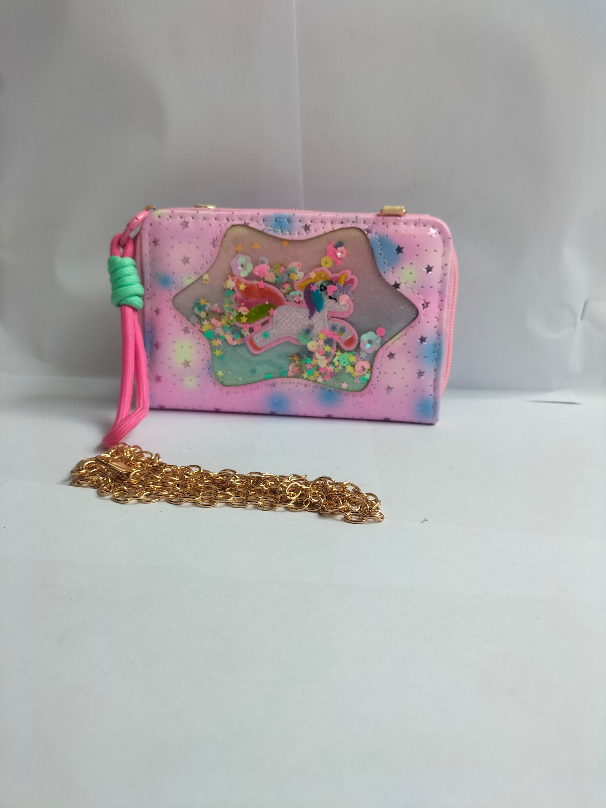 A pastel‑colored, holographic unicorn‑themed mini zip purse with a glittery window and interchangeable pink strap & gold chain. It’s a cute, whimsical accessory for everyday use.