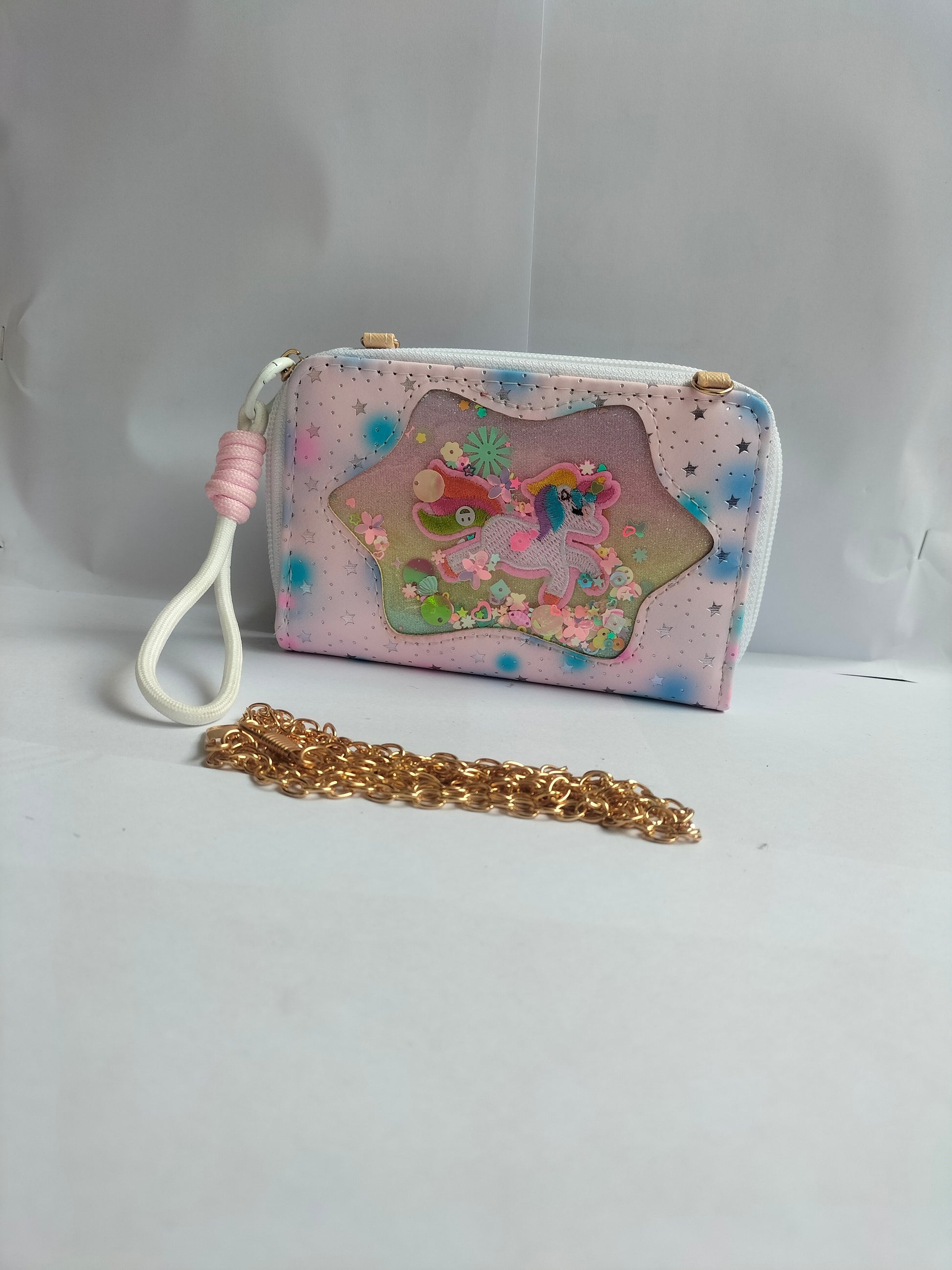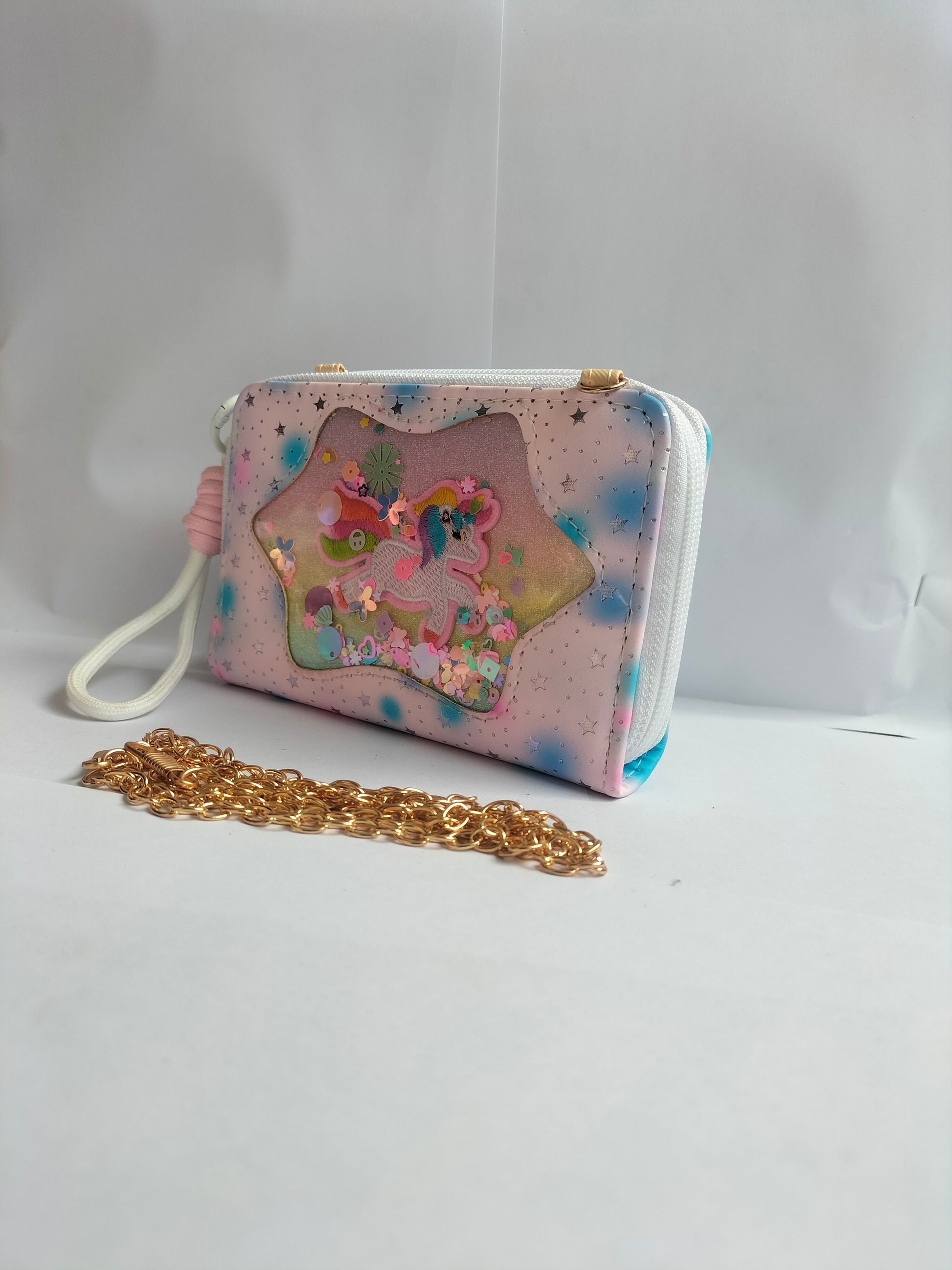 A pastel‑colored, holographic unicorn‑themed mini zip purse with a glittery window and interchangeable white strap & gold chain. It’s a cute, whimsical accessory for everyday use.