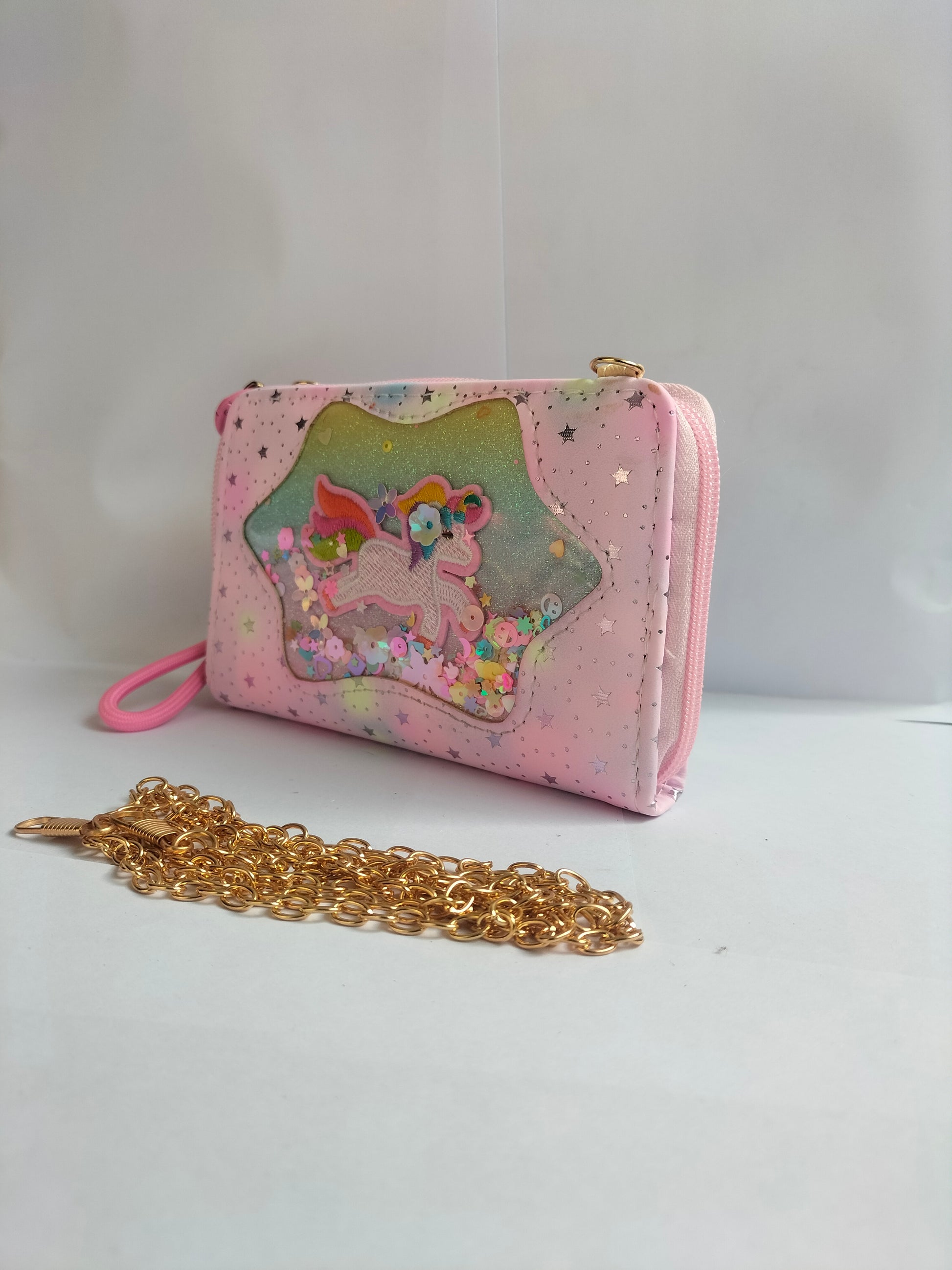 A pastel‑colored, holographic unicorn‑themed mini zip purse with a glittery window and interchangeable baby pink strap & gold chain. It’s a cute, whimsical accessory for everyday use.