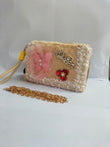 A yellow fluffy rectangular clutch adorned with a pink butterfly, a gold “LOVE” charm, a red bow, pearl & lace trim, and interchangeable yellow strap & gold chain.