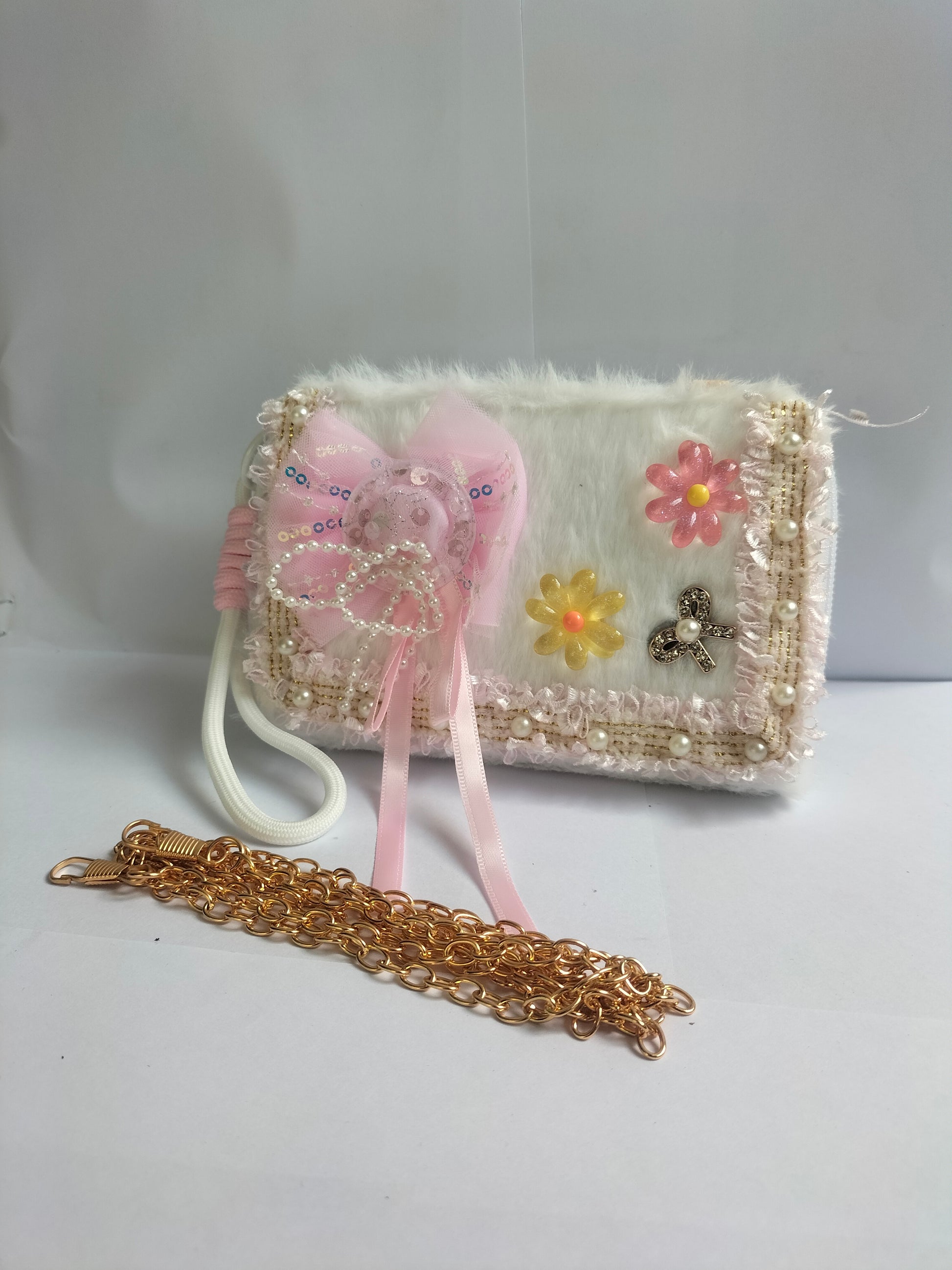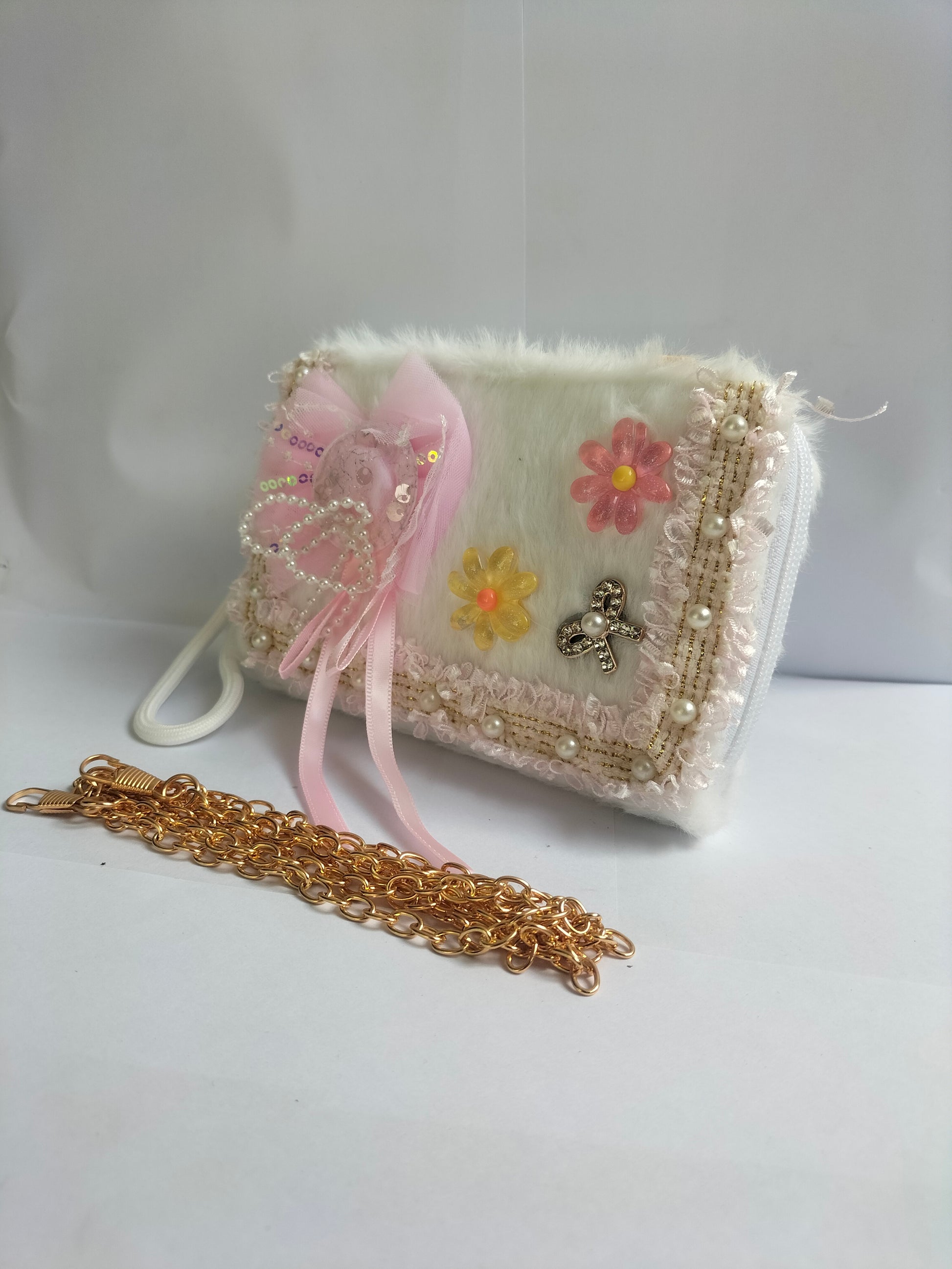 A white fluffy rectangular clutch adorned with a pink butterfly applique, a gold “LOVE” charm, a pink bow with pearl detailing, pearl & lace trim, and two flower embellishments (pink & yellow). It comes with an interchangeable pink fabric strap and a gold chain strap.