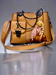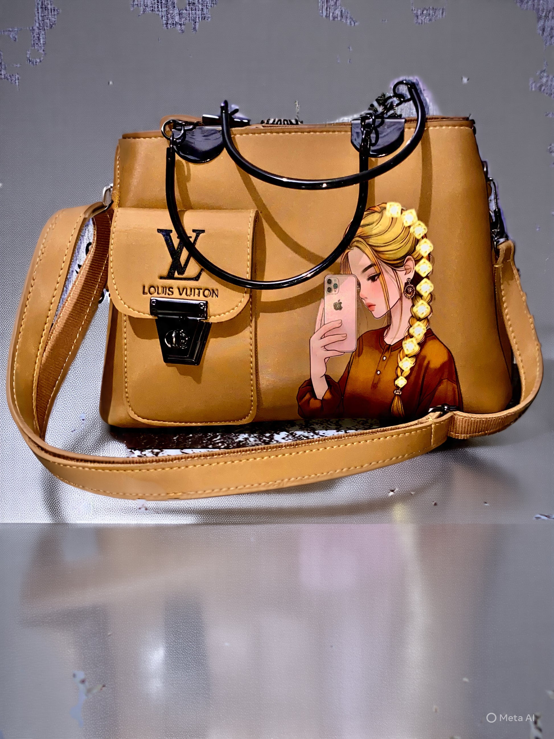 A tan leather Louis Vuitton‑style handbag with black handle, removable strap, LV logo flap, and a printed woman‑selfie design on the side.