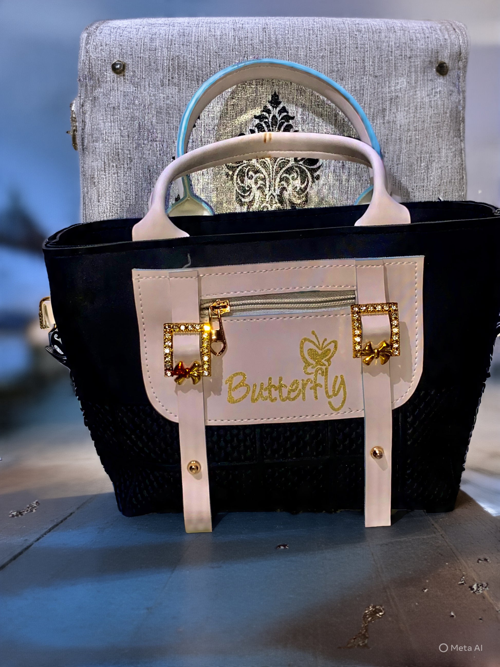 A black‑white handbag with gold “Butterfly” logo, butterfly emblem, white handle, gold‑rhinestone zip clasp, and textured grid bottom.