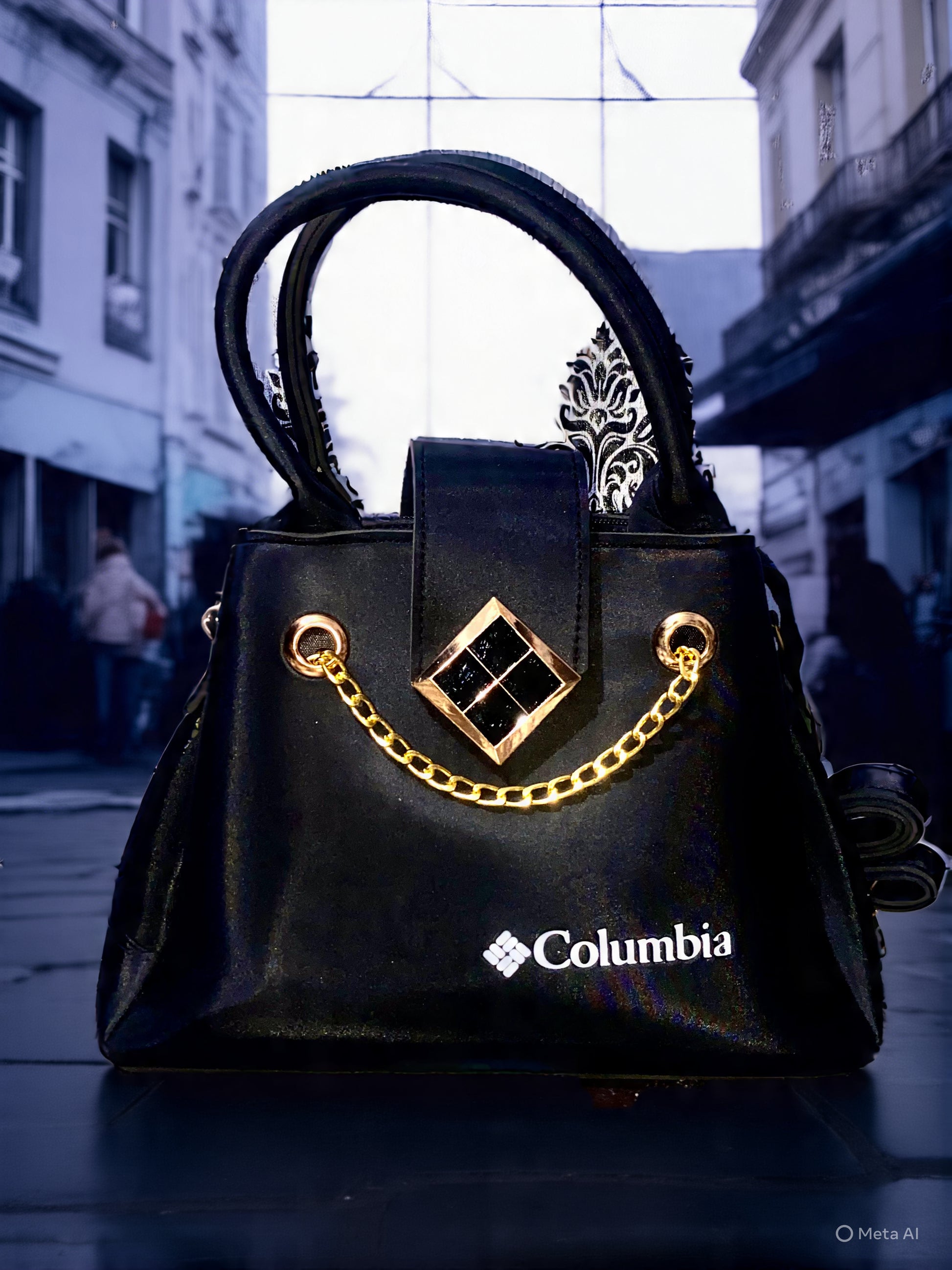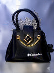 A black Columbia handbag with a gold chain and diamond-shaped clasp on the front. The bag has the white “Columbia” logo printed on it and features spiked, silver decorative handles at the back.