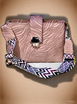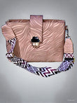 A pink zebra‑striped handbag with black‑violet zig‑zag strap, black button & gold clasp flap, and white interior; usable as shoulder or crossbody.