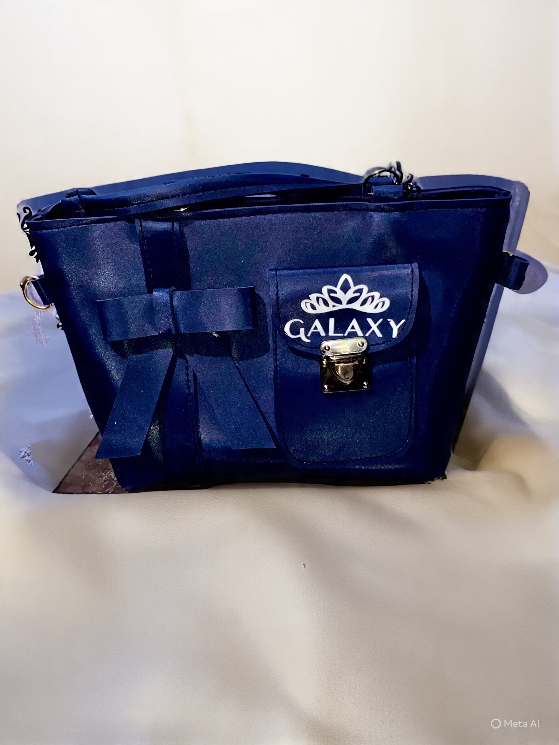 Royal blue handbag with “GALAXY” crown logo, silver clasp, fabric & chain straps, front flap pocket with ribbon bow.
