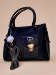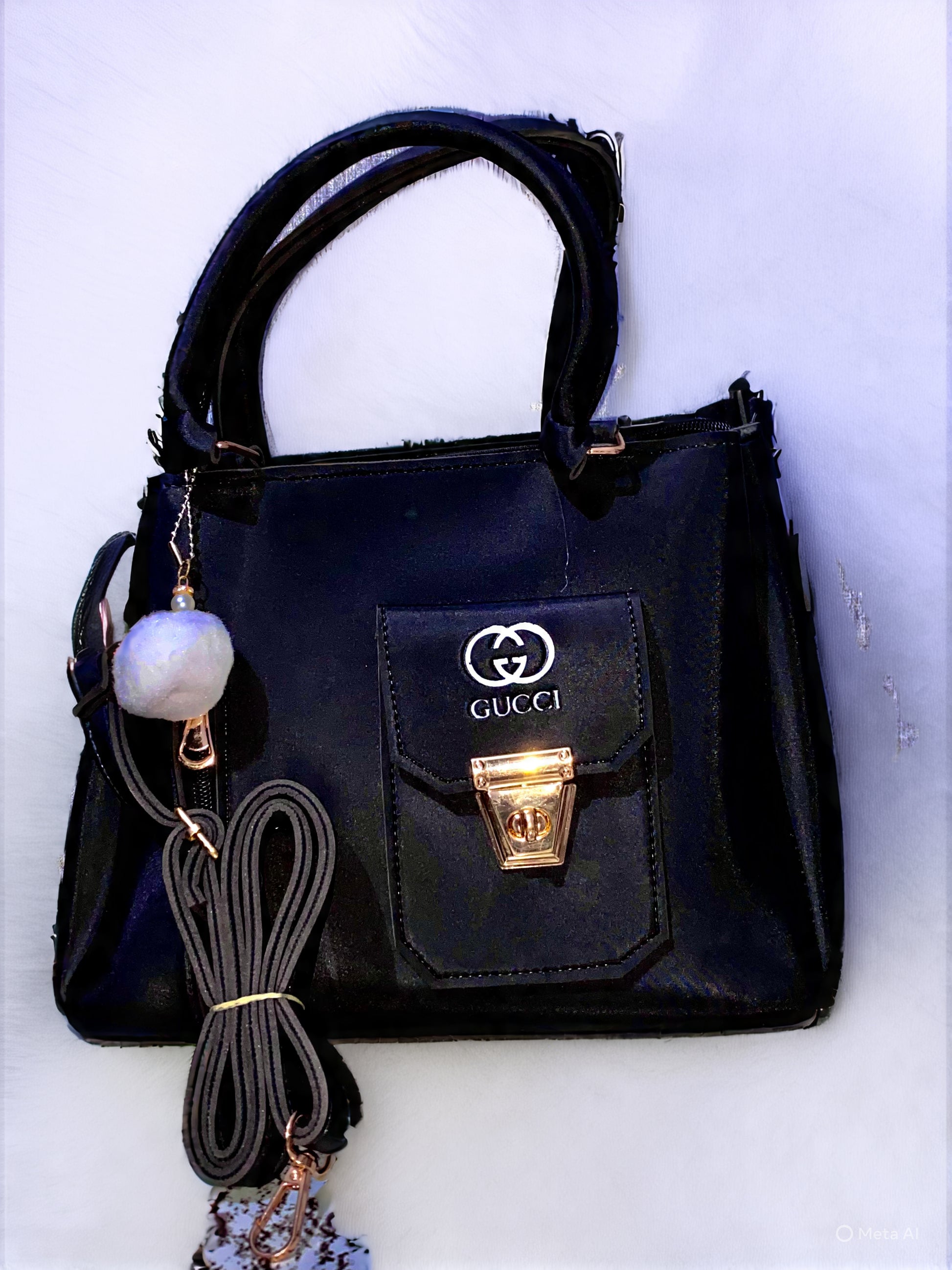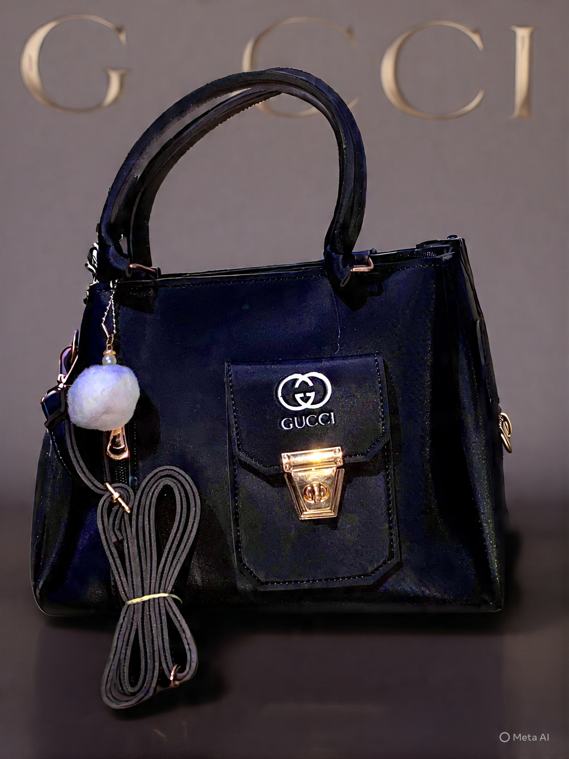 A black satin handbag with gold‑tone “GUCCI” logo, front pocket clasp, removable gray shoulder strap, and a white pom‑pom charm.