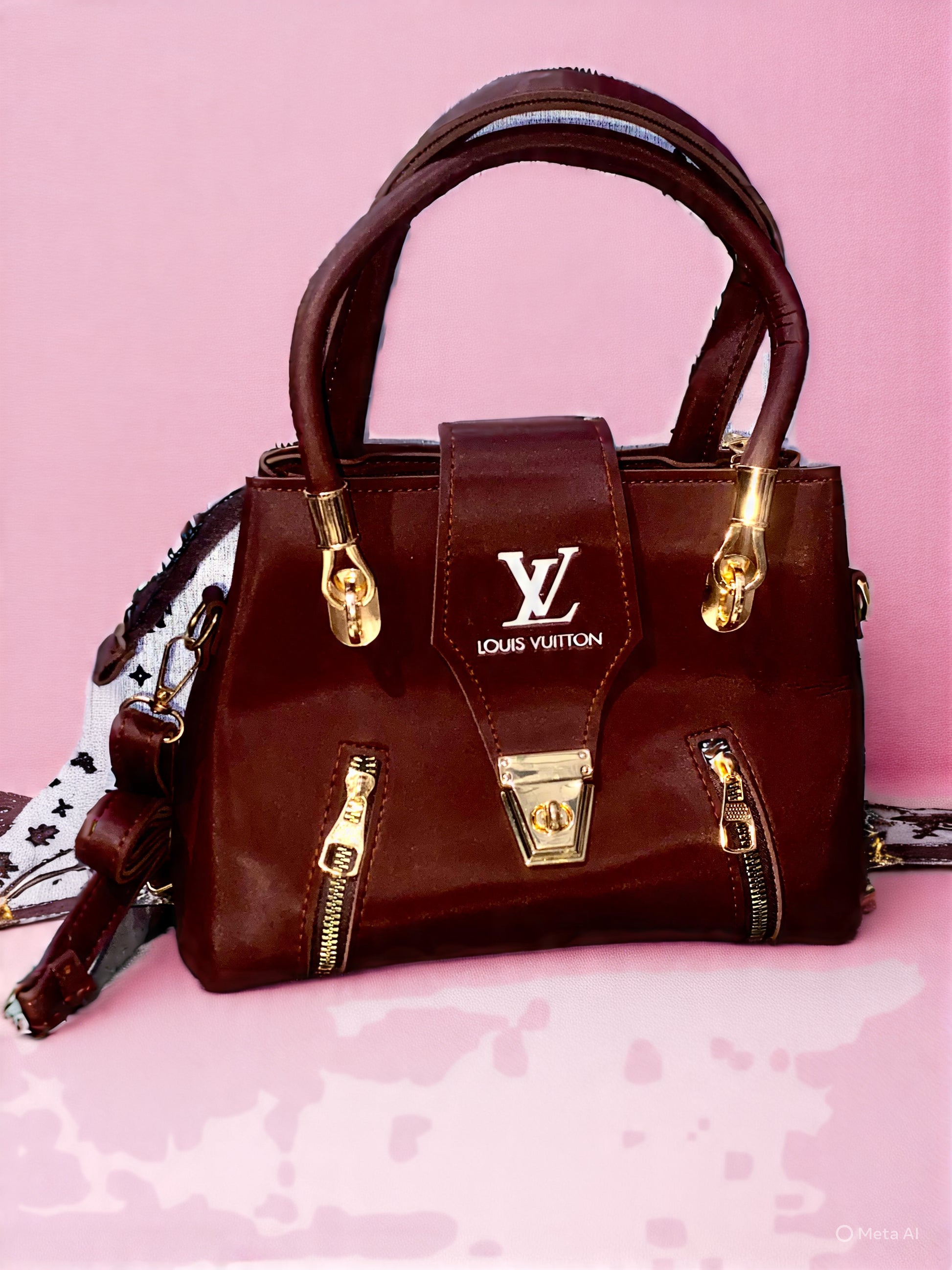 This is a brown Louis Vuitton handbag with gold hardware and a white "LV LOUIS VUITTON" logo. It has two handles and an adjustable shoulder strap. The bag features decorative front zipper pockets and appears to be made of leather‑like material.