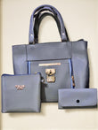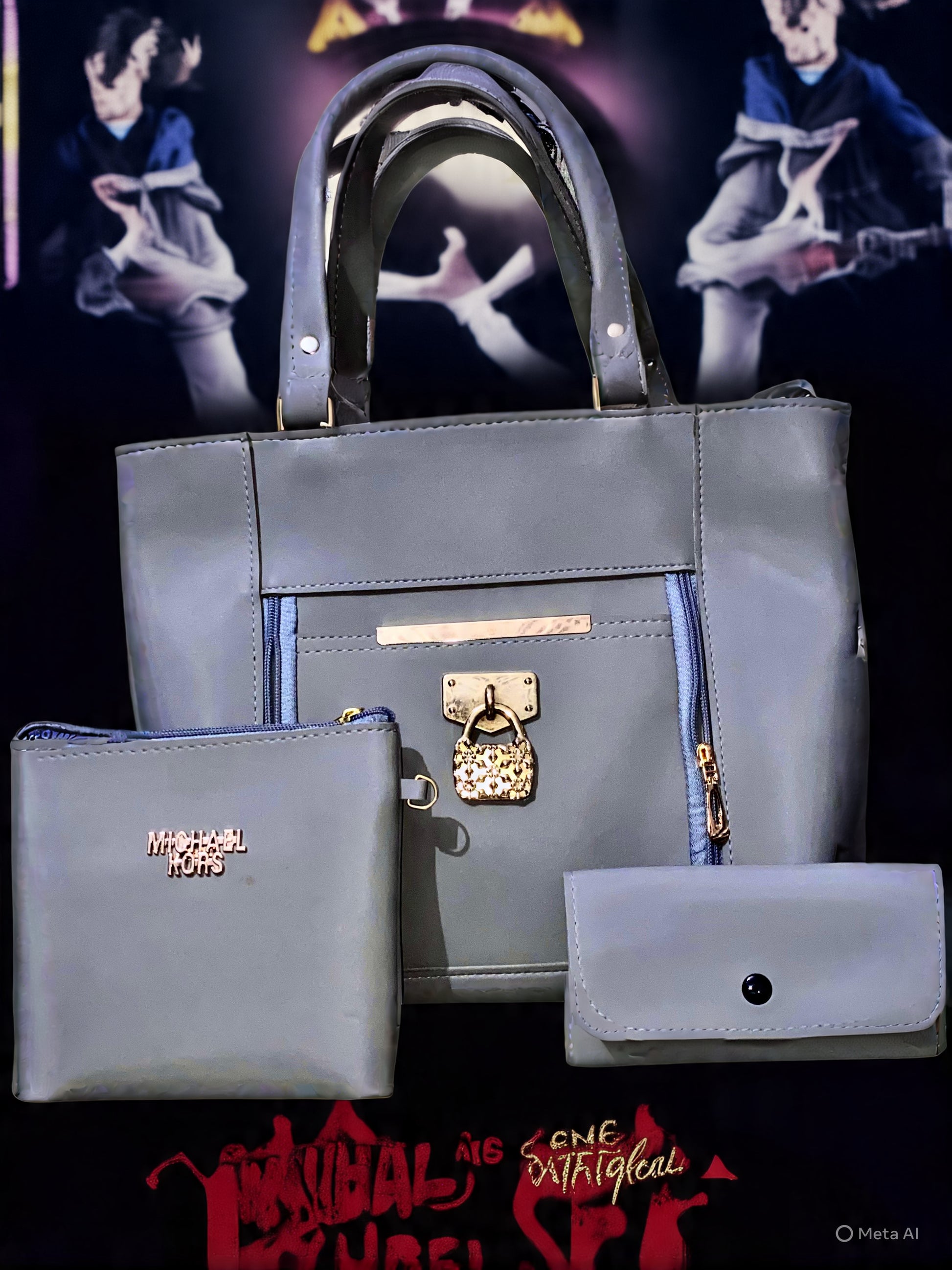 A gray leather 3‑piece handbag set: a main tote with gold hardware & lock charm, a small “MICHAEL KORS” zip pouch, and a matching flat wallet. All pieces are gray with rose‑gold accents.