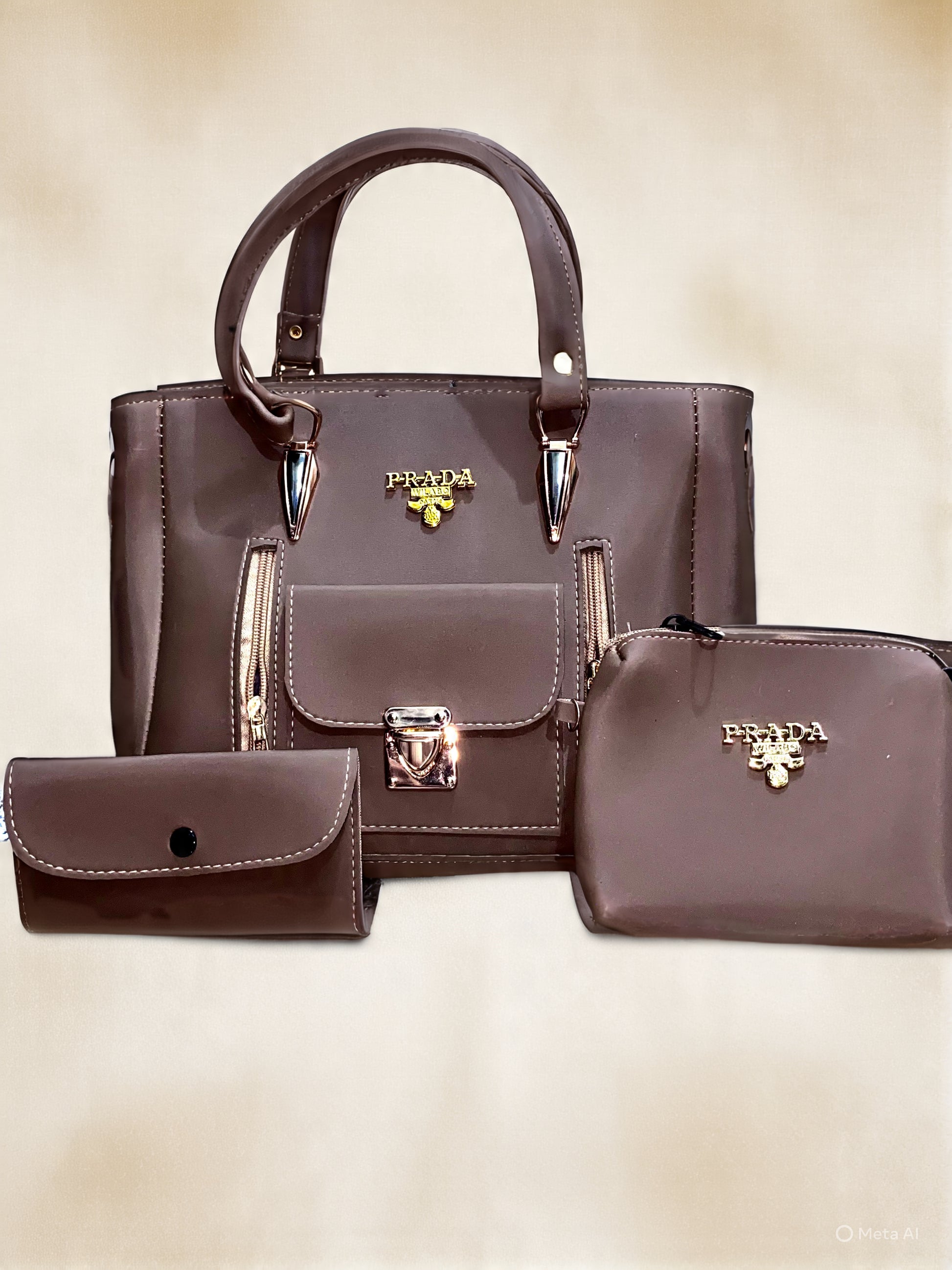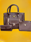 A brown leather 3‑piece handbag set: a main tote with gold hardware & lock charm, a small “MICHAEL KORS” zip pouch, and a matching flat wallet. All pieces are gray with rose‑gold accents