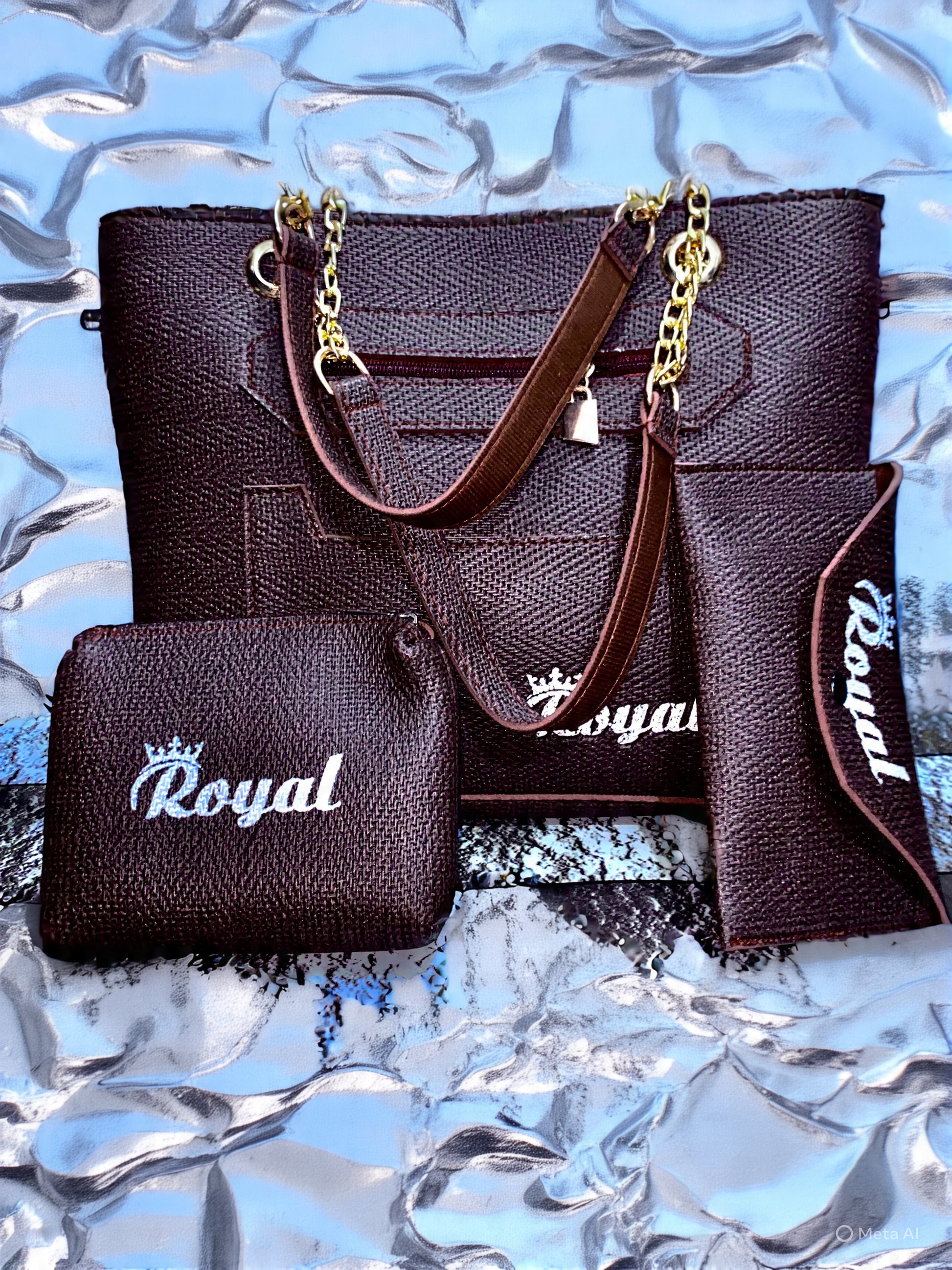 The purse set is a brown textured 3‑piece collection branded *“Royal”* with a crown logo. It includes a main tote with leather straps & gold chain, a small zip pouch, and a slim slip‑in pouch, all featuring the “Royal” embossed design.