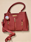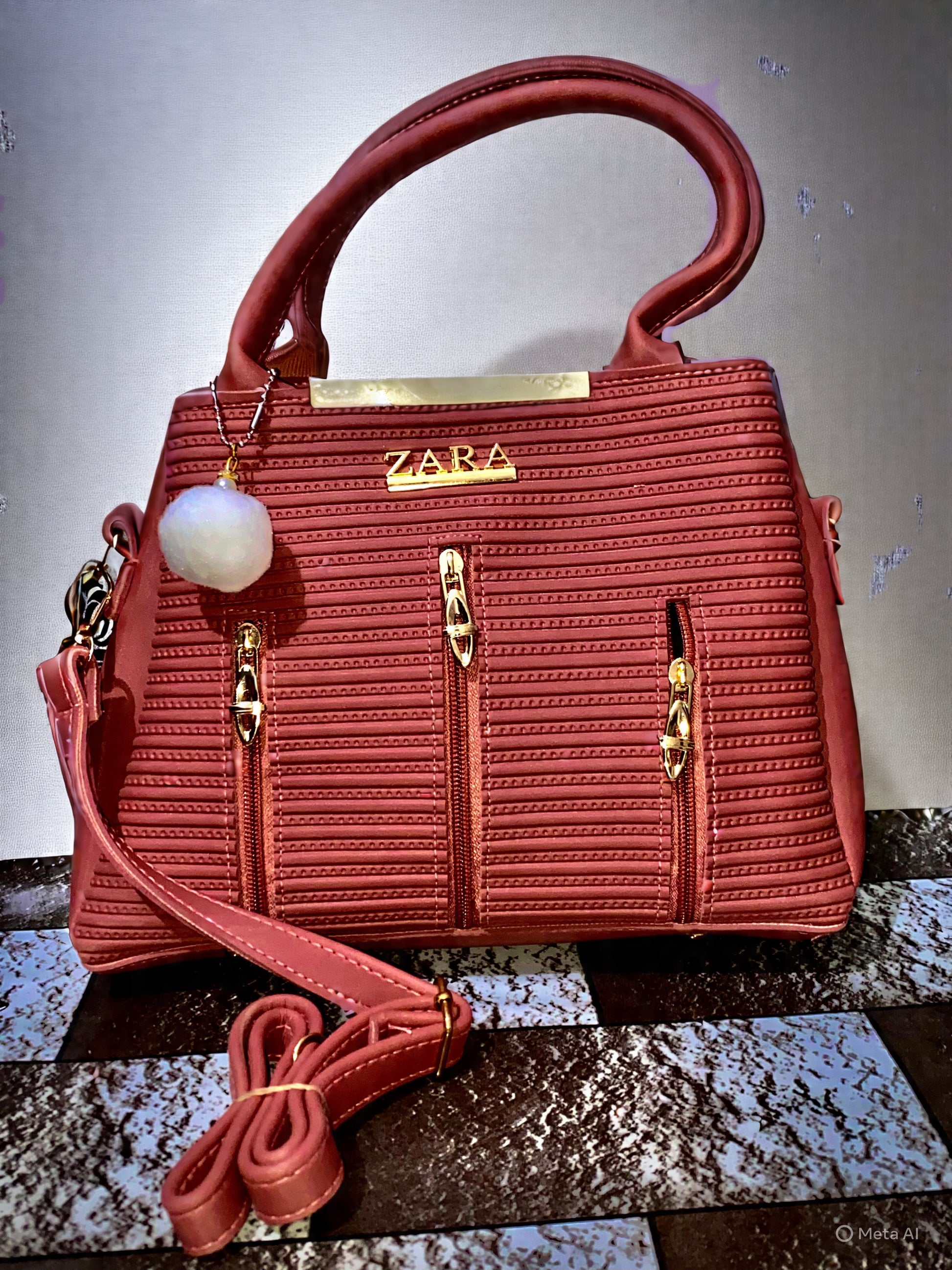 The handbag is a pink, textured leather purse with gold hardware and a pearl charm. It has two zippered compartments on the front, a shoulder strap, and handles. The brand logo on the front reads *ZARA* in gold letters.