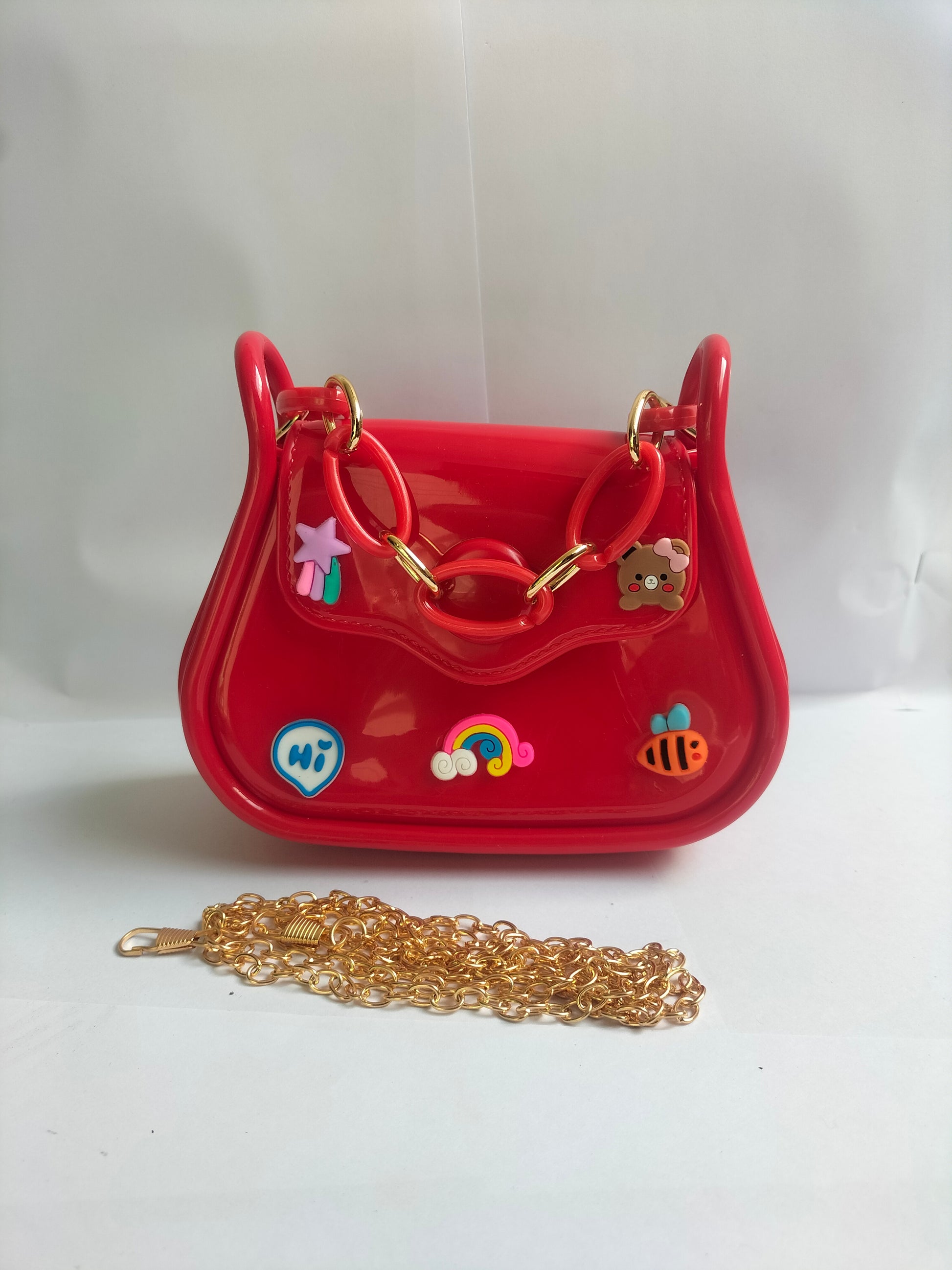 A bright red mini purse with a gold chain strap and decorative charms (star, βHIβ badge, rainbow, bee, and teddy bear) on the front. Itβs a shiny, plastic accessory suitable for kids. π