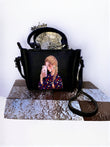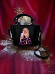 A black leather handbag with a front graphic of a woman in a purple patterned jacket holding a phone. It has a shoulder strap, small side pocket with button, and brand tag “LADY MANIA”.