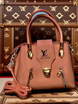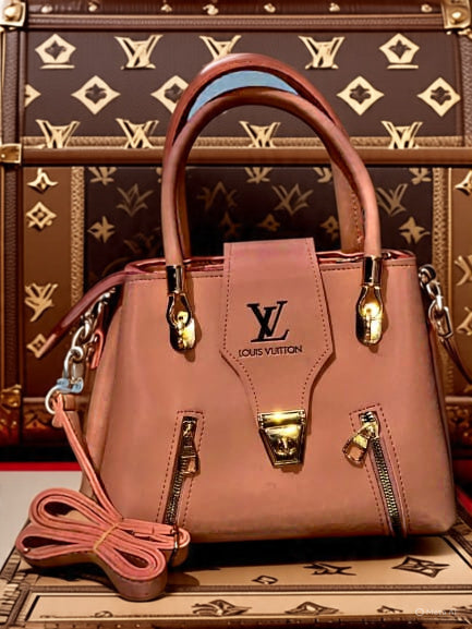 This is a baby pink Louis Vuitton handbag with gold hardware and a white "LV LOUIS VUITTON" logo. It has two handles and an adjustable shoulder strap. The bag features decorative front zipper pockets and appears to be made of leather‑like material.